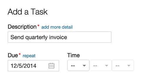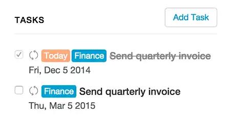 Usually tasks are just one off things that we need to get done and ticked off, but for some activities it's a regular occurrence such as completing a quarterly report or customer check in. To make it easy to manage these we've introduced repeating tasks. Just click the "repeat" link when adding a task.